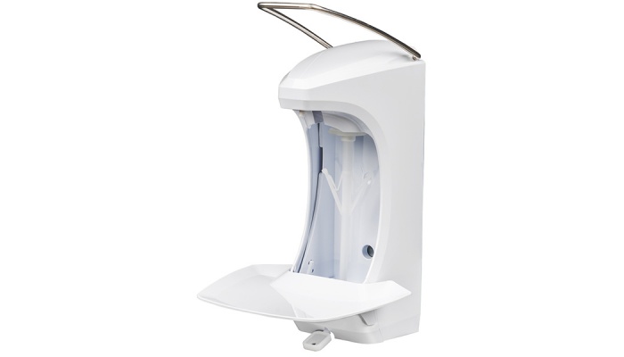 RX 5 M manual dispenser for disinfectant, alco-gel, soap and flowable lotions, for wall mounting, for 500 ml standard Euro bottles (not included), white plastic housing, stainless steel lever, with disposable hygiene pump, 1.5 ml/stroke, lockable dispenser.