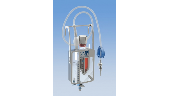 The XL1000SC Sinapi Chest Drain is custom made for post-cardiac surgery patients. It is fitted with a tube roller and high negativity vent. The tube roller facilitates stripping of the tubing to remove clots, maintaining patency. Stripping, however, can generate transient high levels of negative intra-thoracic pressure which can be detrimental to tissues and areas being drained. The high negativity vent, positioned in the connector of this Sinapi chest drain, ensures that excessively high negative pressures cannot be achieved during this procedure. Using the Sinapi tube roller and high negativity vent therefore results in effective drainage and a reduction in blocked chest catheters without risk to the patient.